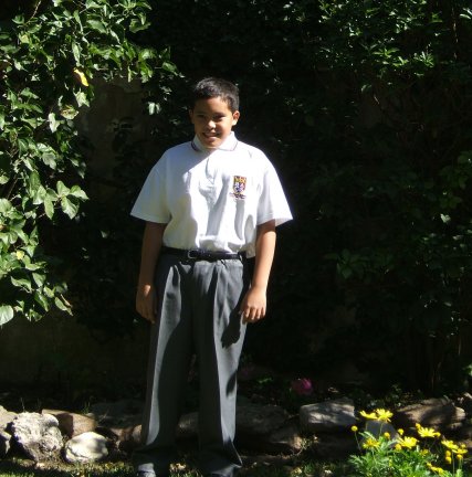 In my new school uniform, standing in our back yard.